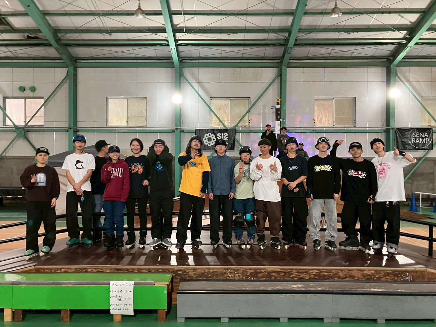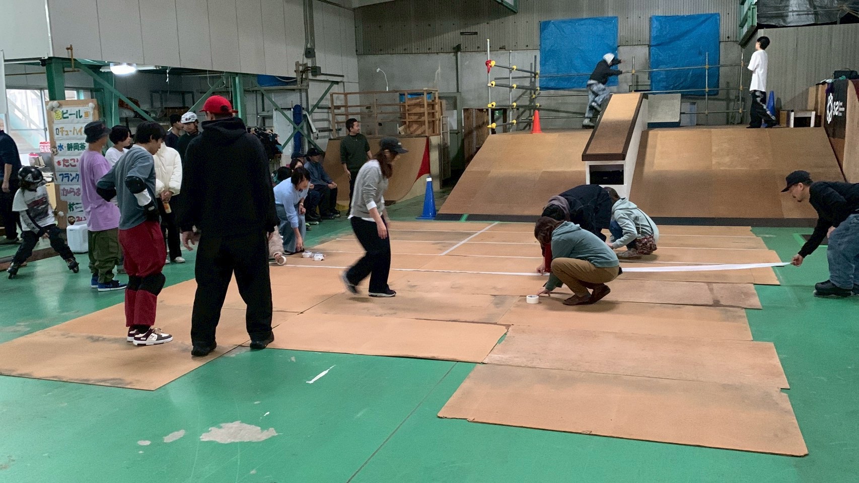 前日から雨続き、屋内なので雨の影響はないものの、高い湿度に集まったスケーターの熱気で滑走面に結露が発生。一時開催そのものが危ぶまれましたが、会場のみんなで急遽資材を敷いて滑走面を確保。